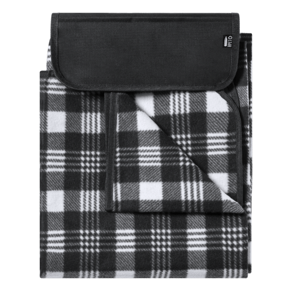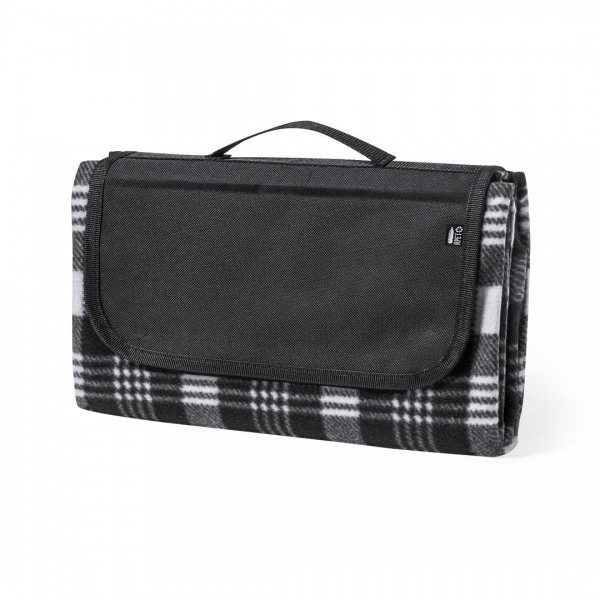 Manta de picnic de calidad premium, fabricada en poliéster RPET de 160g/m2, elaborado a partir de plástico reciclado para así fomentar la reutilización de residuos plásticos y contribuir a la sostenibilidad del planeta. Medidas 120x150cm, con lado para sentarse en patrón tartán bicolor de suave tacto. Lado en contacto con el suelo en resistente PEVA. De fácil plegado y de tamaño compacto, incluye asa de transporte y solapa con cierre de velcro, con distintivo RPET en etiqueta.