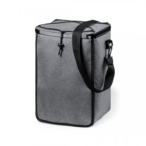 Set de barbacoa con 3 accesorios. Incluye: Bolsa de transporte/nevera fabricada en resistente poliéster RPET 300D, elaborado a partir de plástico reciclado, para así fomentar la reutilización de residuos plásticos y ayudar a la sostenibilidad del planeta. Con cinta para hombro ajustable de cierre de mosquetón e interior isotermo en PEVA, para conservar la temperatura de los alimentos. Distintivo RPET en etiqueta etiqueta exterior. Paleta, pinzas y trinchador metálicos, con mangos en color negro. 3 Accesorios