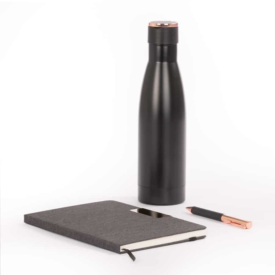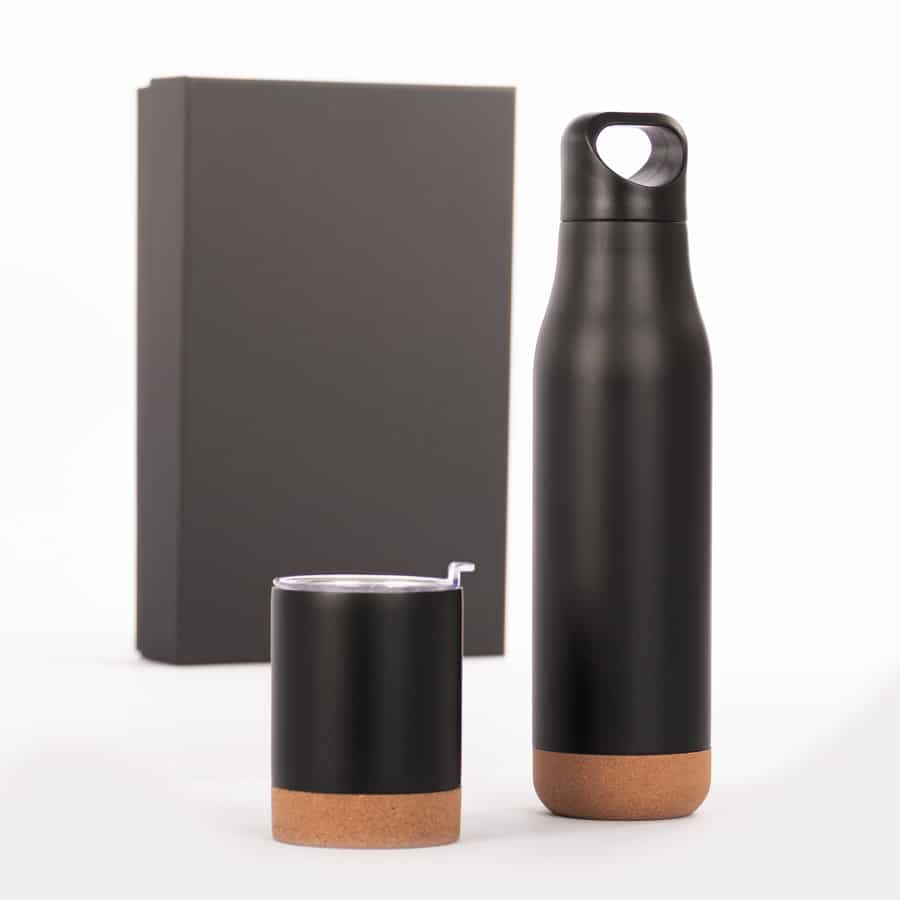 Set de Termo 1/2 litro con tapa twist-off con asa + Mug 200 cc con tapa removible de plástico PS Crystal Clear con sello cilíndrico de silicona, ambos en Acero Inoxidable color negro, con base aislante de corcho, para una mejor adhesión a la superficie. Producto BPA FREE, para el contacto con líquidos y alimentos. Presentación en elegante caja de carton color negro con tapa, interior cuna de EVA aterciopelada negra. Sobre funda de papel negro.
